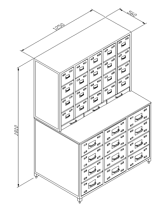 长×宽×高:1250×(560/900)×1800mm(台面高910mm),上部小抽屉分2格,每格内空为205×205×155mm;下部大抽屉可分隔1~4格,隔四格时,每格内空为255×180×155mm; |