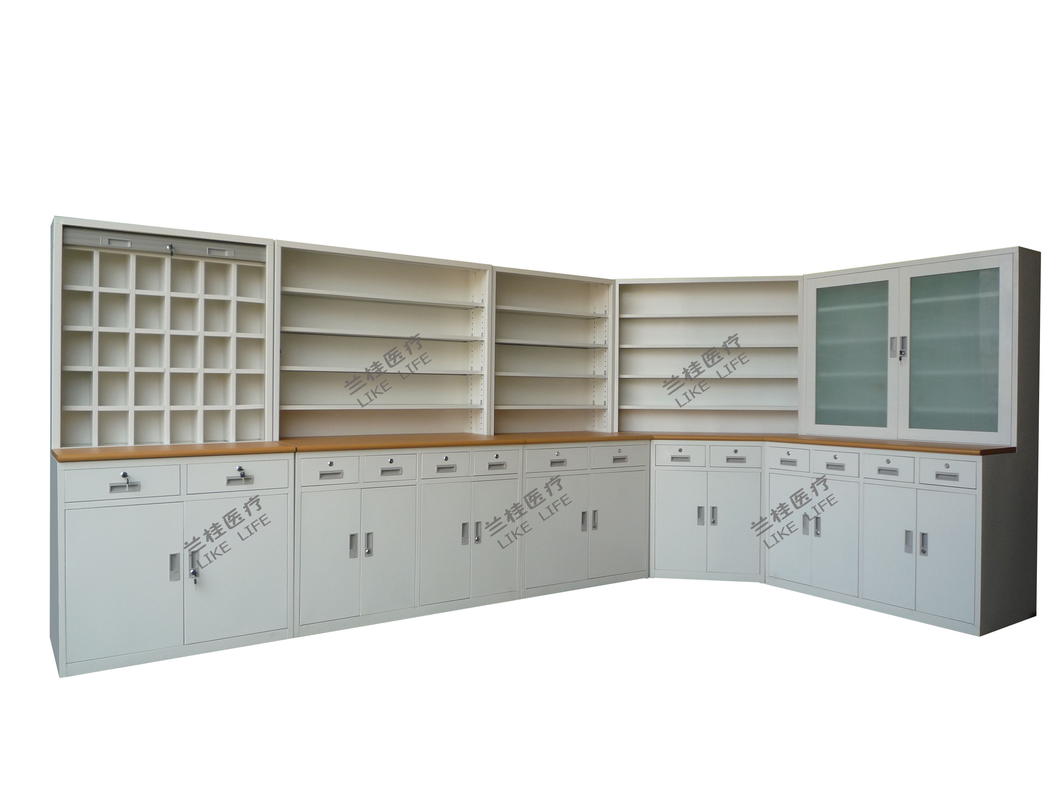 ◆上部采用放置层板四层,间距可任意调节;台面下为抽屉,配三节抽屉导轨,抽屉锁;