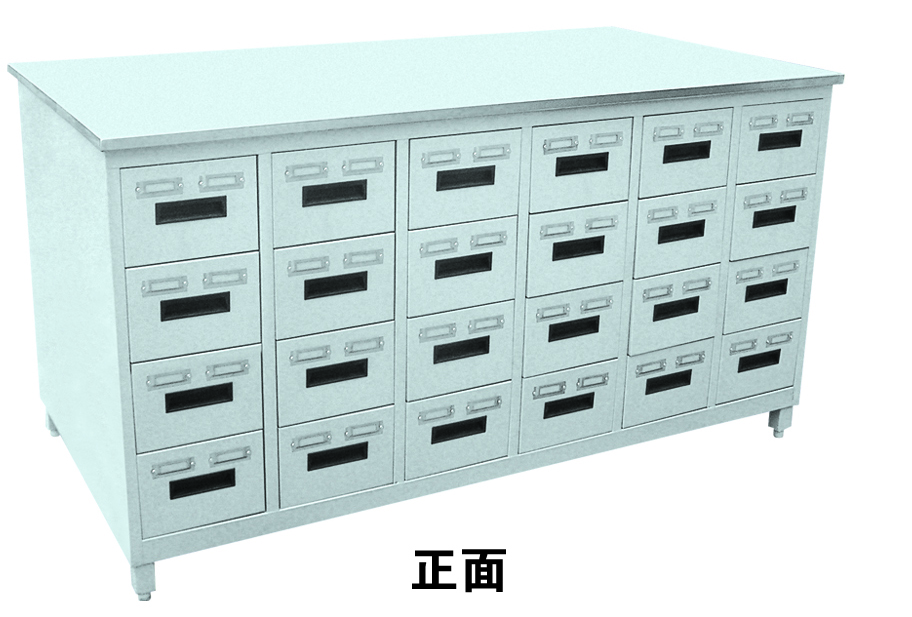◆前面为24个抽屉,每个小抽屉装2个塑料斗,后面为8个金属抽屉,共计放56味药;